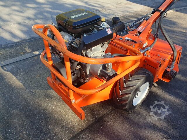 Profesionální jednonápravový kultivátor s dvouválcovým benzínovým motorem Briggs & Stratton o výkonu 16 HP, plynulý hydropohon pojezdu, hydraulický pohon hřídele kultivátoru s nastavením rychlosti, výškově nastavitelná řídicí tyč, 197 provozních hodin podle měřidla.